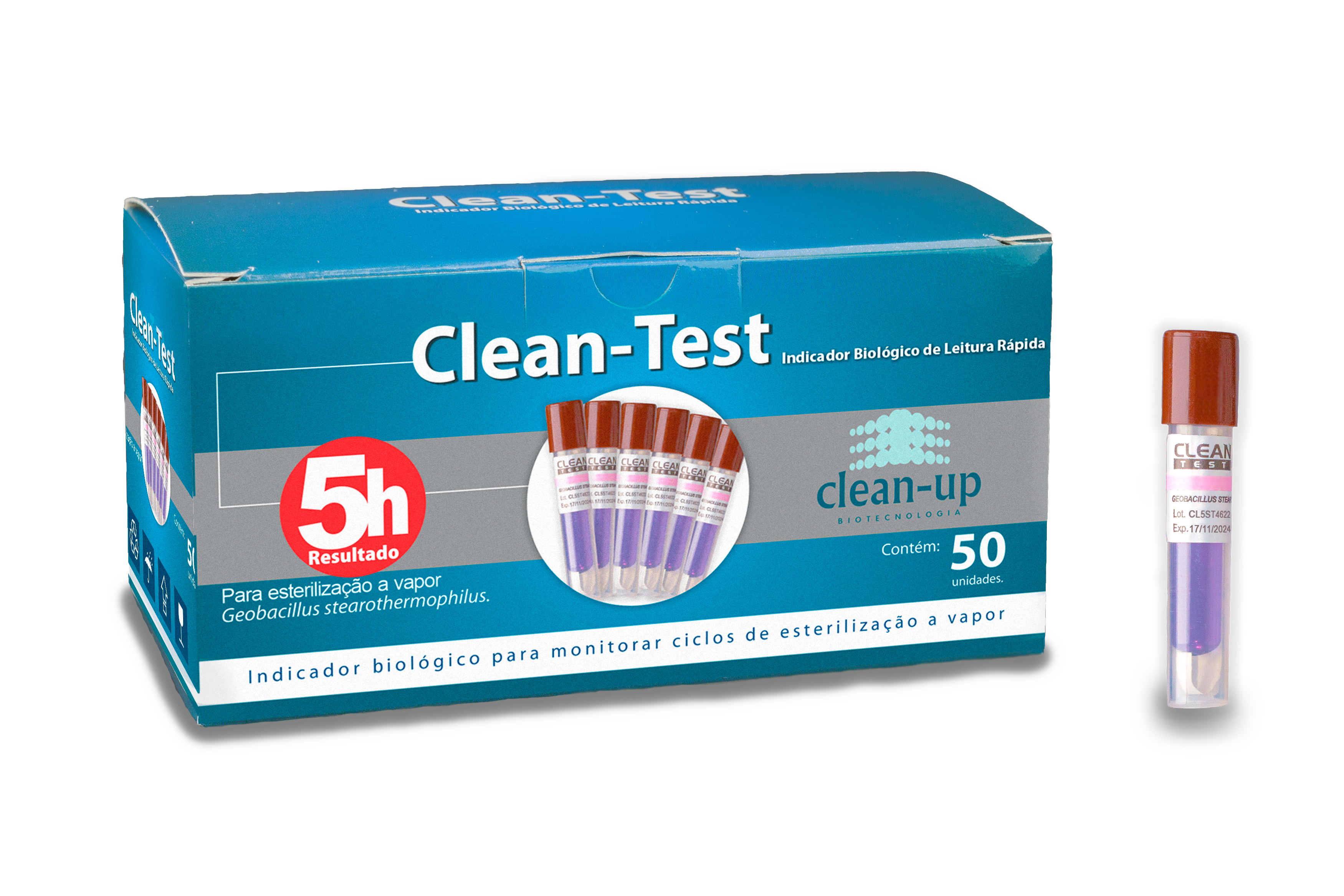 Indicador Biológico do tipo autocontido 2° geração para monitorar ciclos de esterilização a vapor, com tempo de confirmação de resultado em 10 horas. Composto por uma tira de papel, impregnado com esporos de Geobacillus Stearothermophillus ATCC 7953 (não patógeno) contendo população mínima de 1 x 105, ampola de vidro lacrada e quebrável, contendo meio de cultura específico, leitura por sistema de *fotocolorimetria.